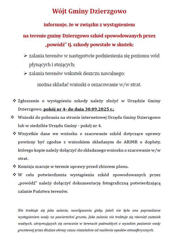 Wójt Gminy Dzierzgowo informuje, że w związku z wystąpieniem na terenie gminy Dzierzgowo szkód spowodowanych przez „powódź”, mózna składać wniosek o oszacowanie strat.