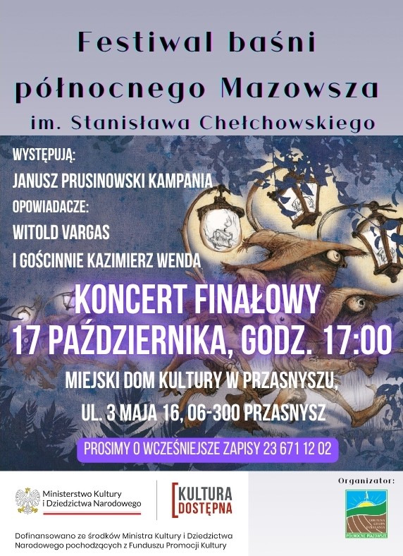 Zapraszamy na finałowy koncert„Festiwalu Baśni Północnego Mazowsza im. Stanisława Chełchowskiego”, który odbędzie się dnia 17 października 2025 roku o godzinie 17:00 w Miejskim Domu Kultury im. Stanisława Ostoi-Kotkowskiego w Przasnyszu, ul. 3 Maja 16.