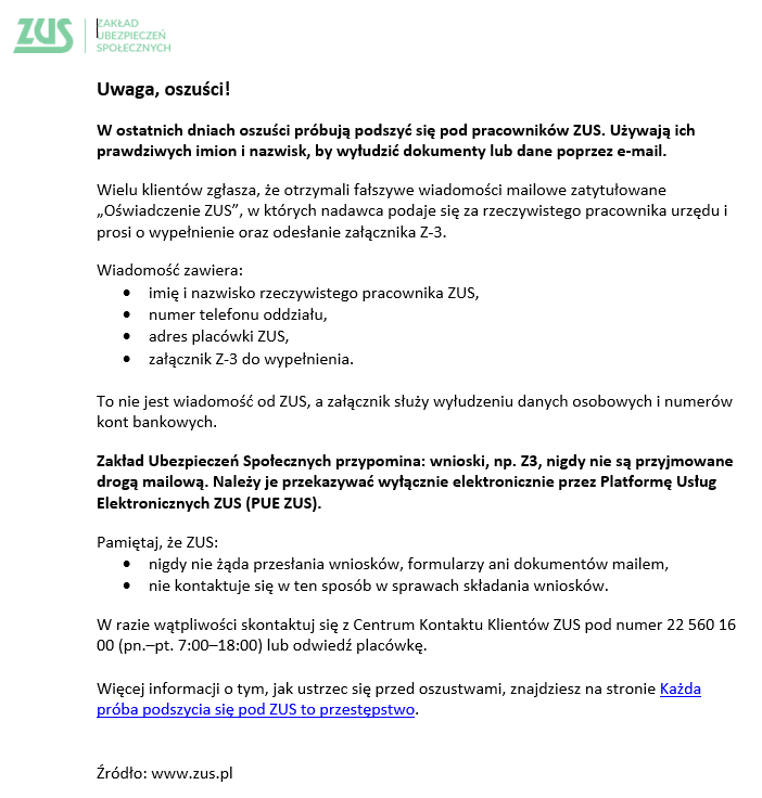 W ostatnich dniach oszuści próbują podszyć się pod pracowników ZUS. Używają ich prawdziwych imion i nazwisk, by wyłudzić dokumenty lub dane poprzez e-mail.