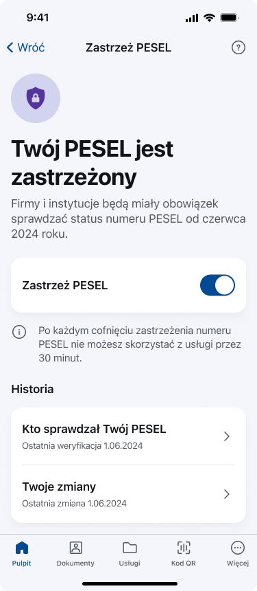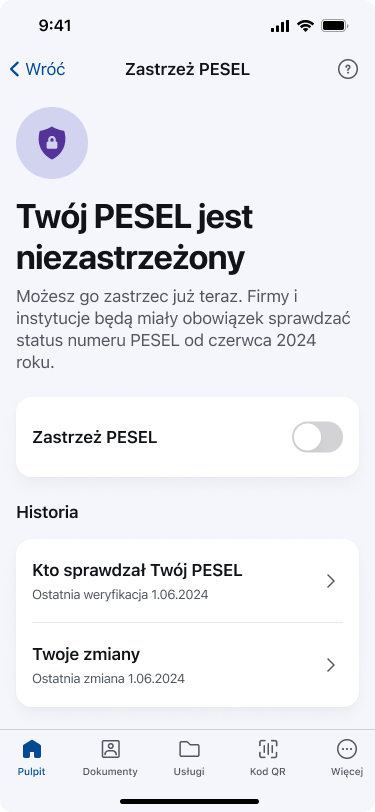 Liczbaprób wyłudzeń kredytów na cudze dane rośnie. Ministerstwo Cyfryzacji wprowadziło więcdo aplikacji mObywatel 2.0 usługę Zastrzeż PESEL. Dzięki niej użytkownik może zastrzec swój numer PESEL, cofnąć zastrzeżenie i ponownie je ustawić. Widzi też, jakie firmy i instytucje sprawdzały jego numer PESEL i z jakiego powodu. Od 1 czerwca 2024 instytucje finansowe będą miały obowiązek sprawdzeniastatusu numeru PESEL np. przed udzieleniem pożyczki.
